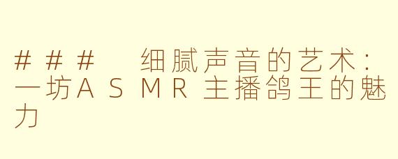 近年来,ASMR(自发性知觉经络反应)逐渐流行,一坊ASMR主播鸽王凭借其独特的声音和专业的制作技巧,赢得了大量粉丝的喜爱。鸽王擅长使用各种道具,创造出令人放松的音效,从轻柔的耳语到细腻的敲击声,每一段音频都仿佛是在为听众编织一个梦境。